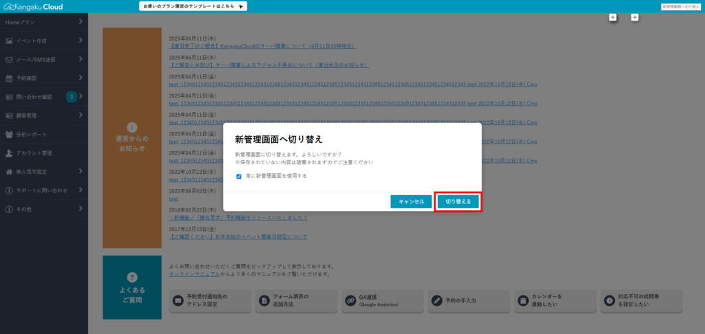 旧管理画面から新管理画面に切り替えるには、次のように操作してください。